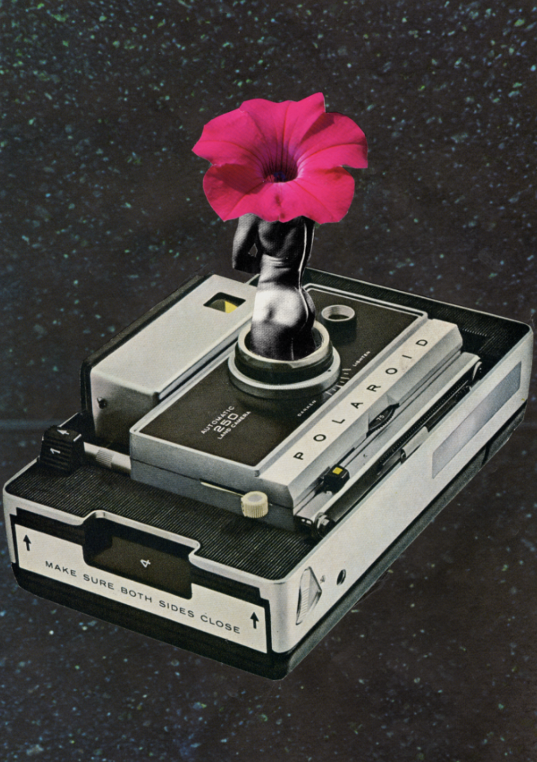 This collage presents a nude man with a flower head emerging from a camera lens against the infinite expanse of the universe. The image symbolizes the act of coming out as queer, with the camera lens representing the restrictive lens of society. The man’s emergence, blossoming like a flower, celebrates the beauty and strength found in embracing one’s true identity.