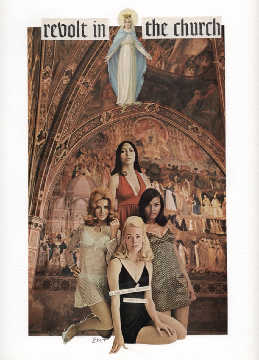 This collage depicts four women with unwavering gazes in front of a church interior. The words “revolt in the church” and “O Mary, my Mother, dwell in me,” as well as the image of Mary hovering over them, suggest that women are at the forefront of the current uprising in the Catholic Church, demanding equality and challenging its hypocrisies.
